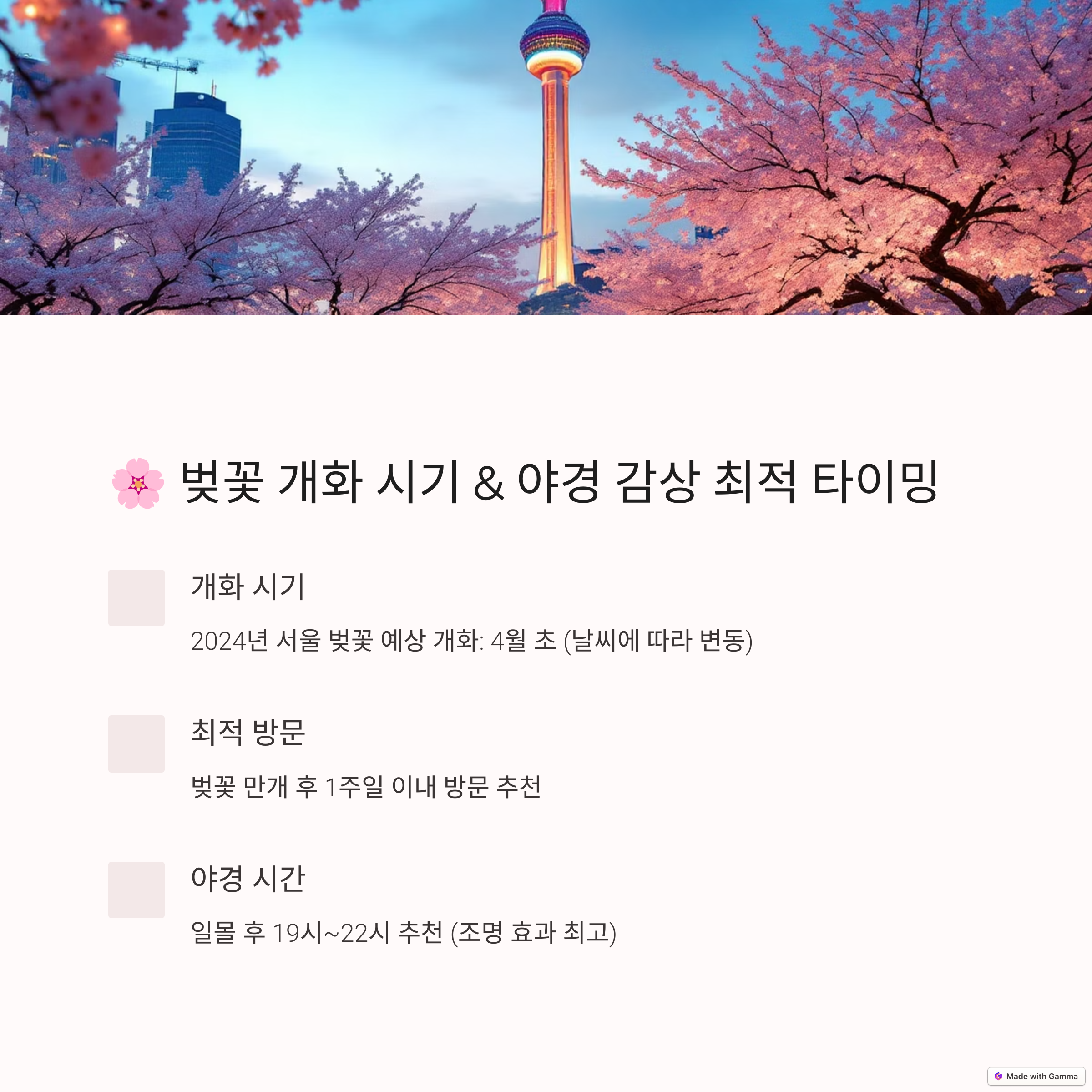 | 벚꽃 개화 시기 | 야경 명당 시간 | 사진 꿀팁 |