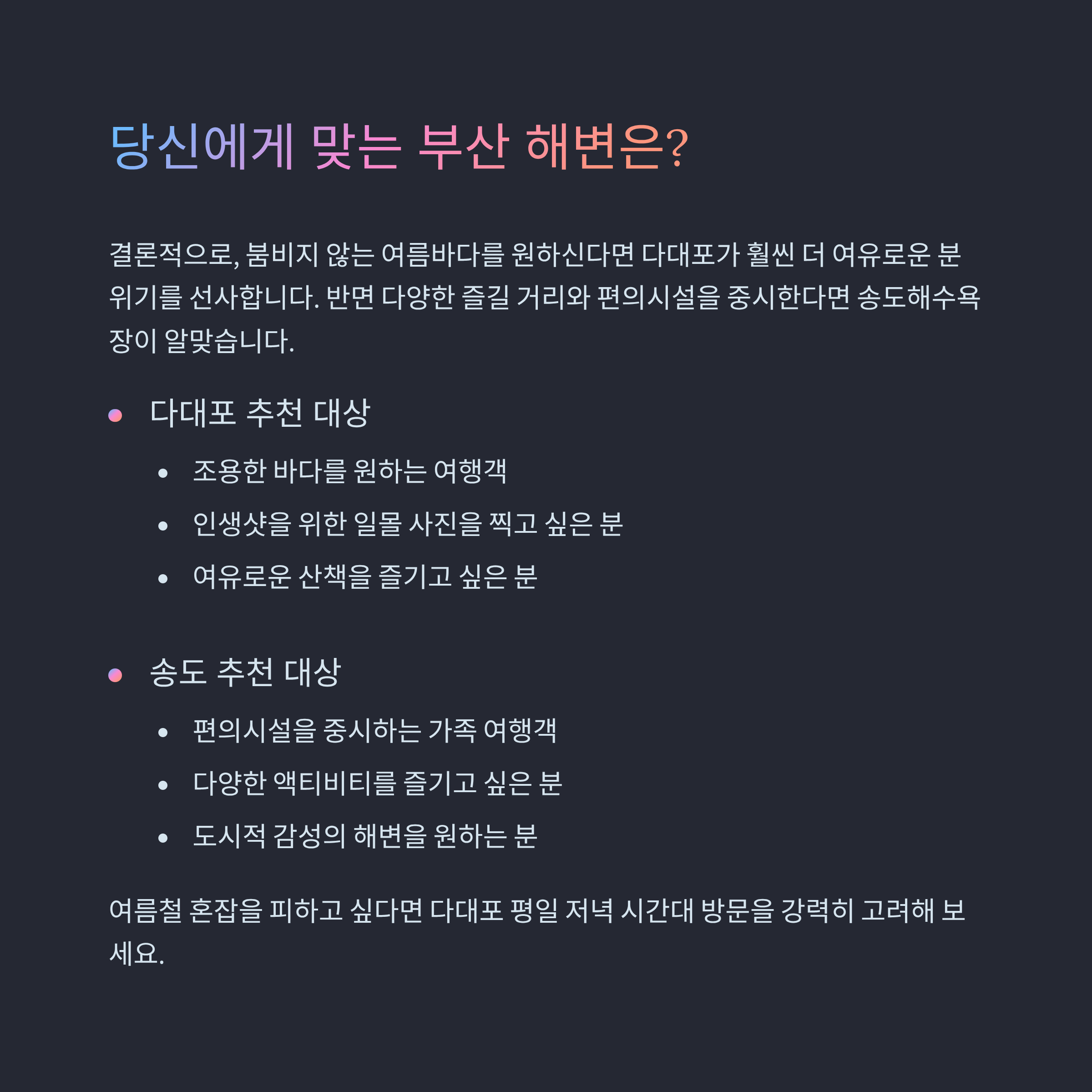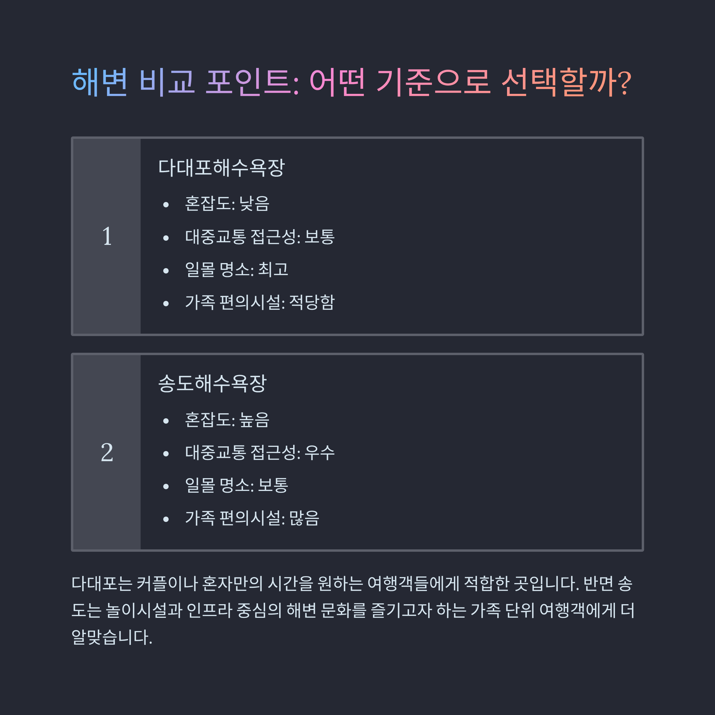 중시한다면 송도해수욕장이 알맞습니다. 여름철 혼잡을 피하고 싶다면