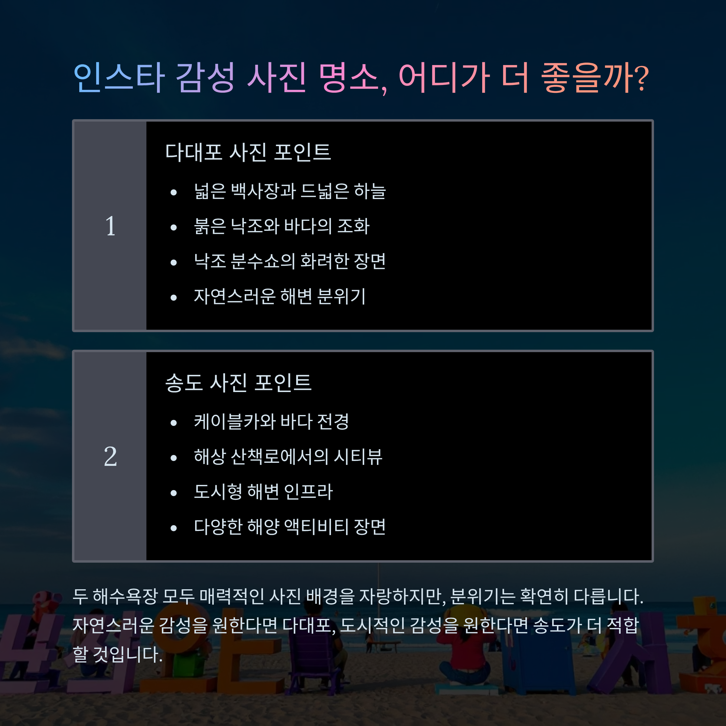 해양 액티비티나 도시형 해변 분위기를 담아내기 좋습니다. 두 해수욕장 모두