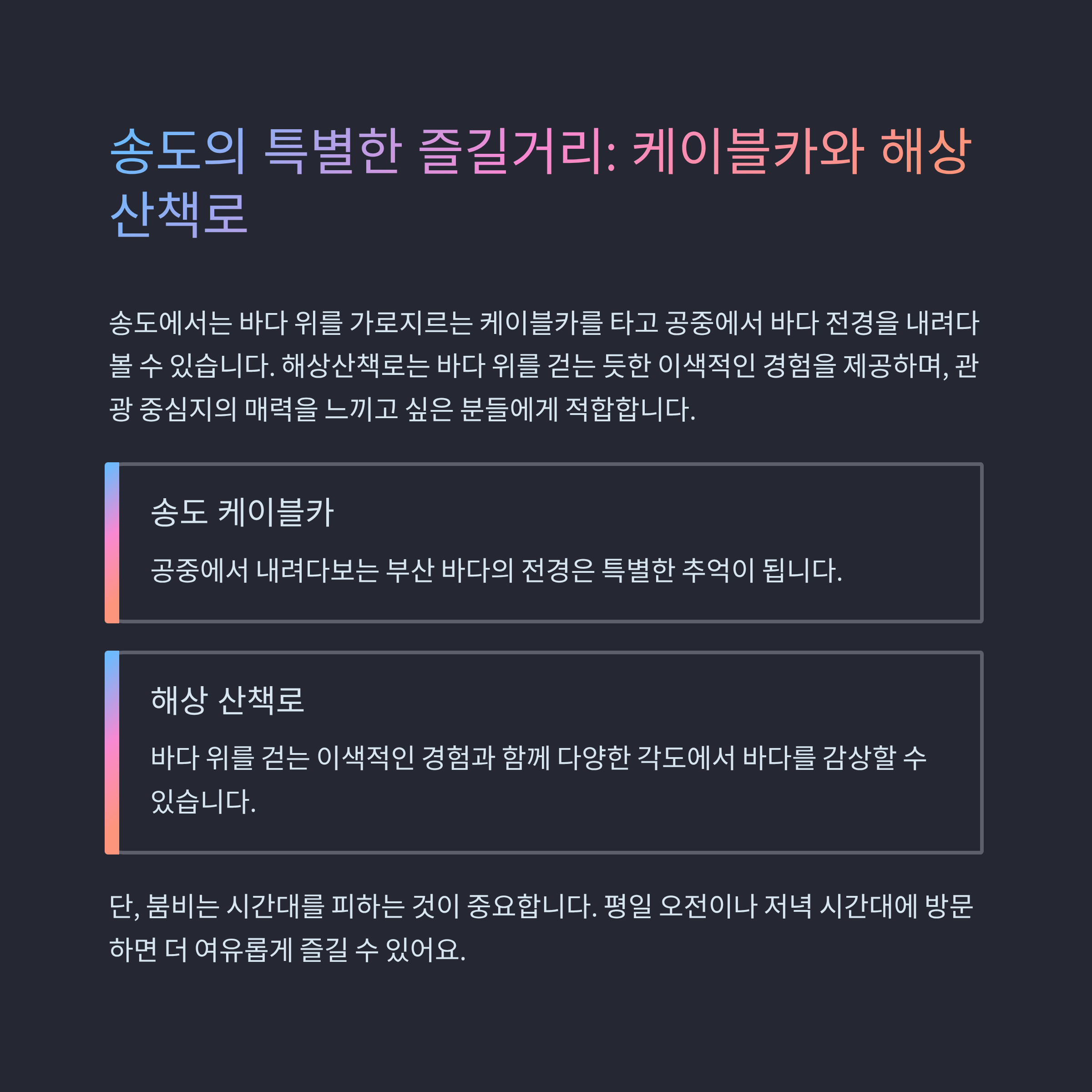 송도는 부산 최초의 해수욕장으로 접근성이 좋아 연중 관광객이 많은 곳입니다.