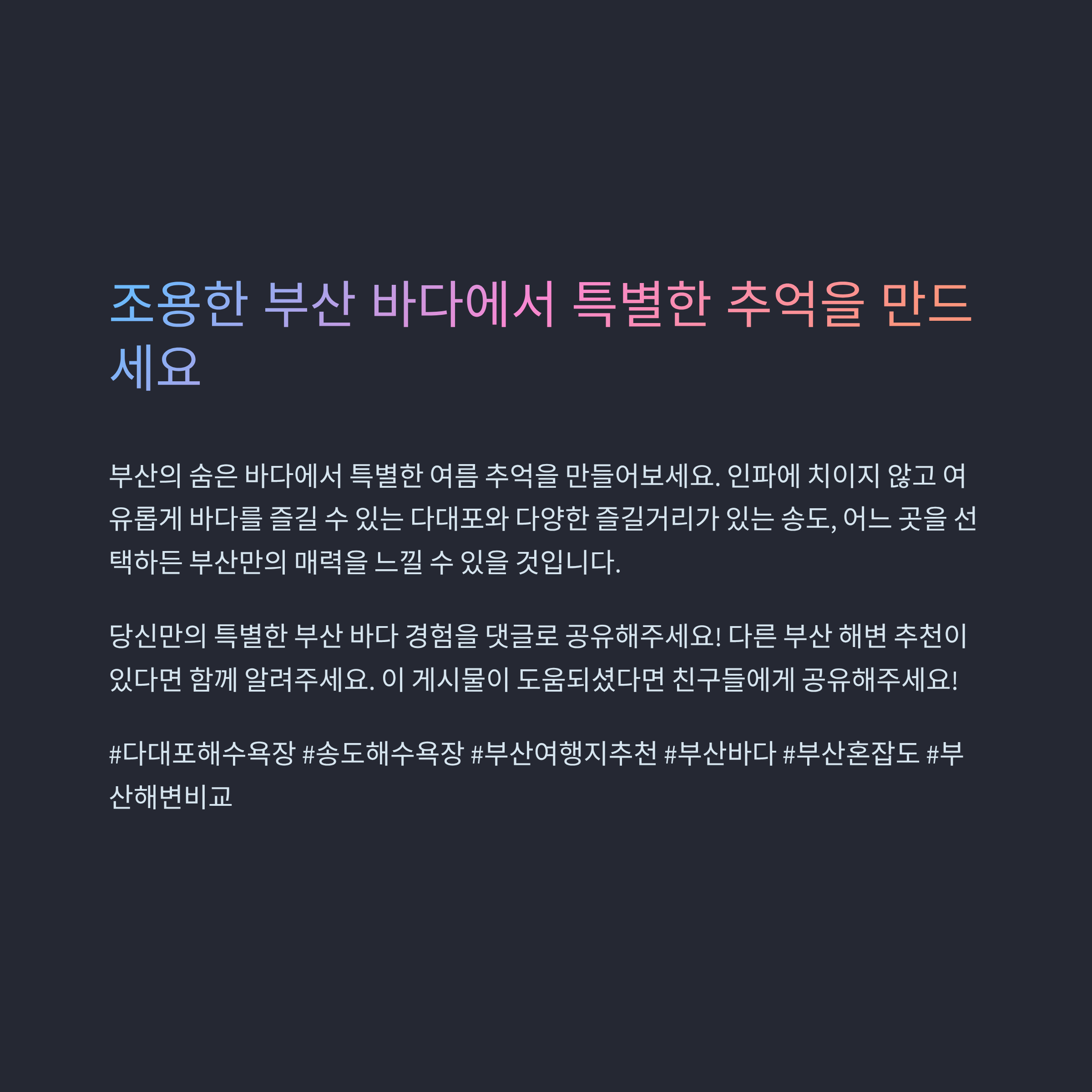 결론적으로 말씀드리자면, 붐비지 않는 여름바다를 원하신다면 다대포가