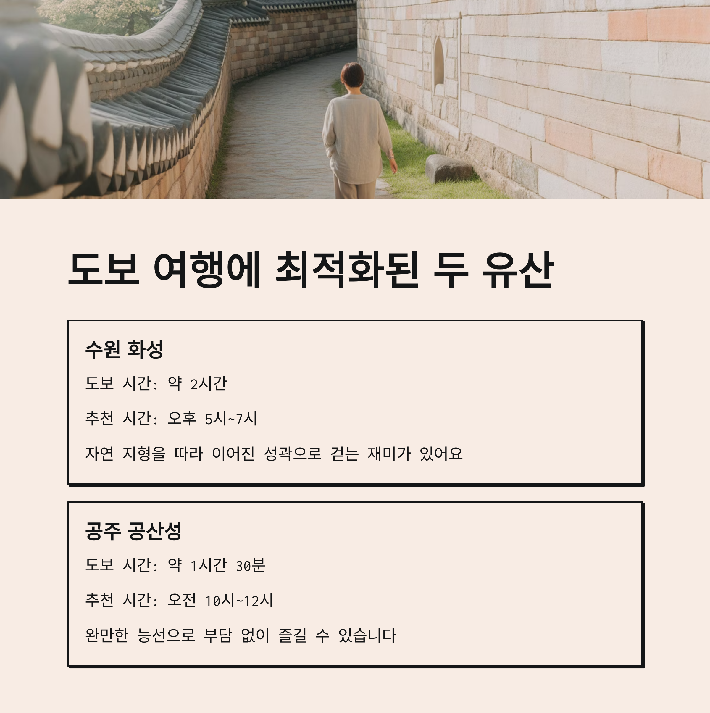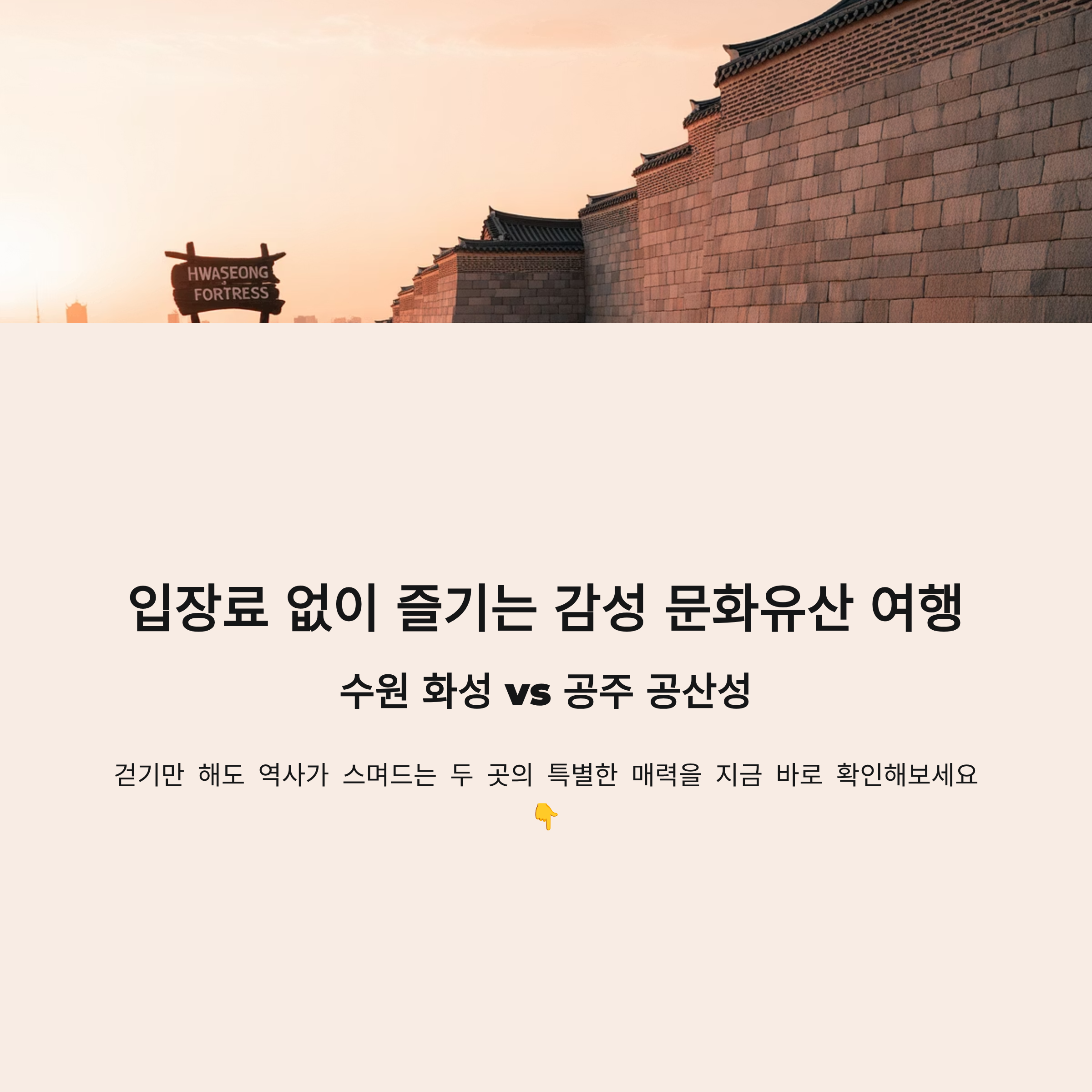 역사와 전통을 간직한 두 문화유산, 수원 화성과 공주 공산성은 입장료 없이도 그 매력을 오롯이 느낄 수 있는 여행지입니다. 이번 글에서는 두 유적지의 특징과 분위기를 비교하며, 감성 충전이 가능한 여행 포인트들을 소개합니다. 걷기만 해도 풍경과 역사가 스며드는 장소, 당신의 문화 여행을 책임질 두 곳을 살펴보세요.