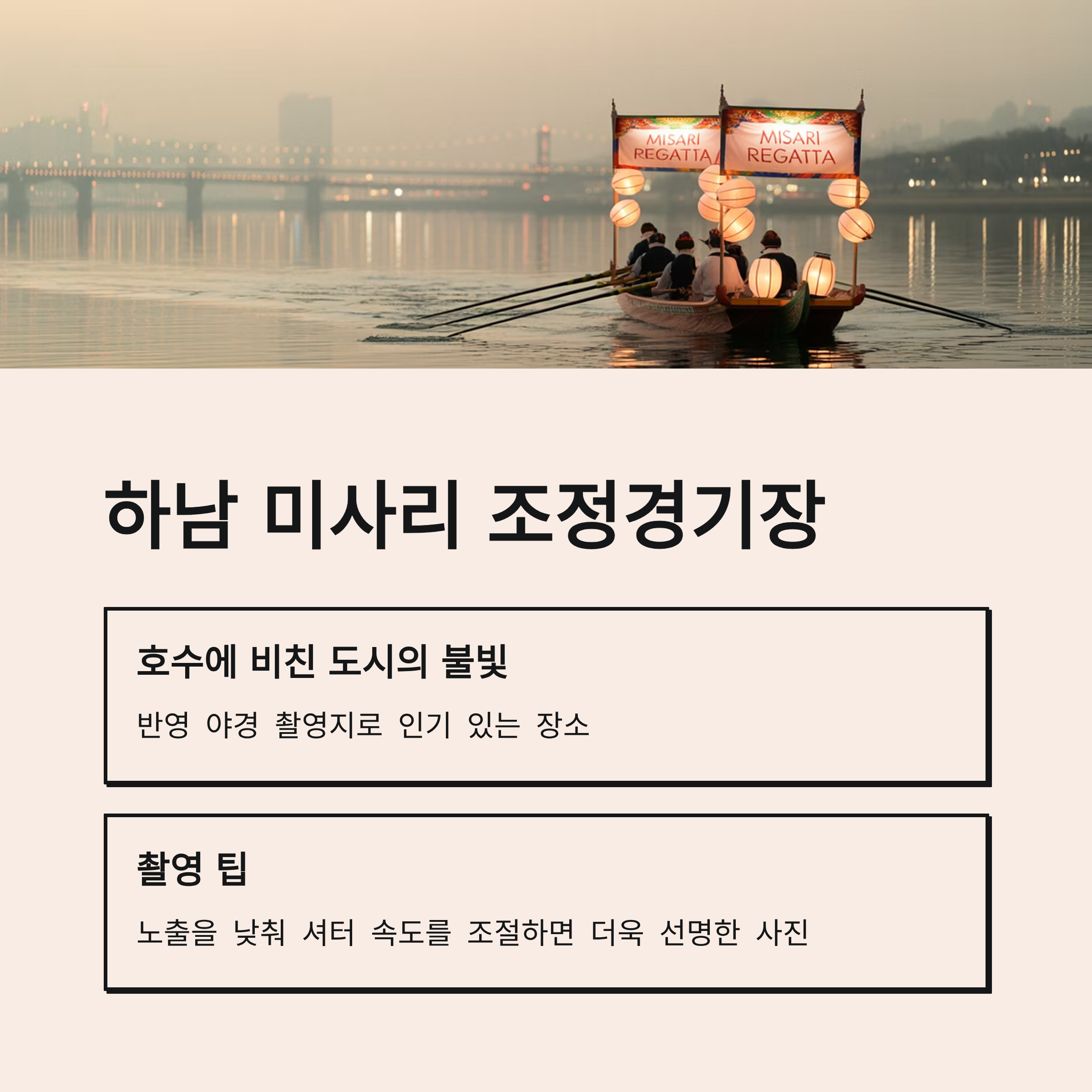 하남 미사리 조정경기장은 반영 야경 촬영지로 인기입니다.
