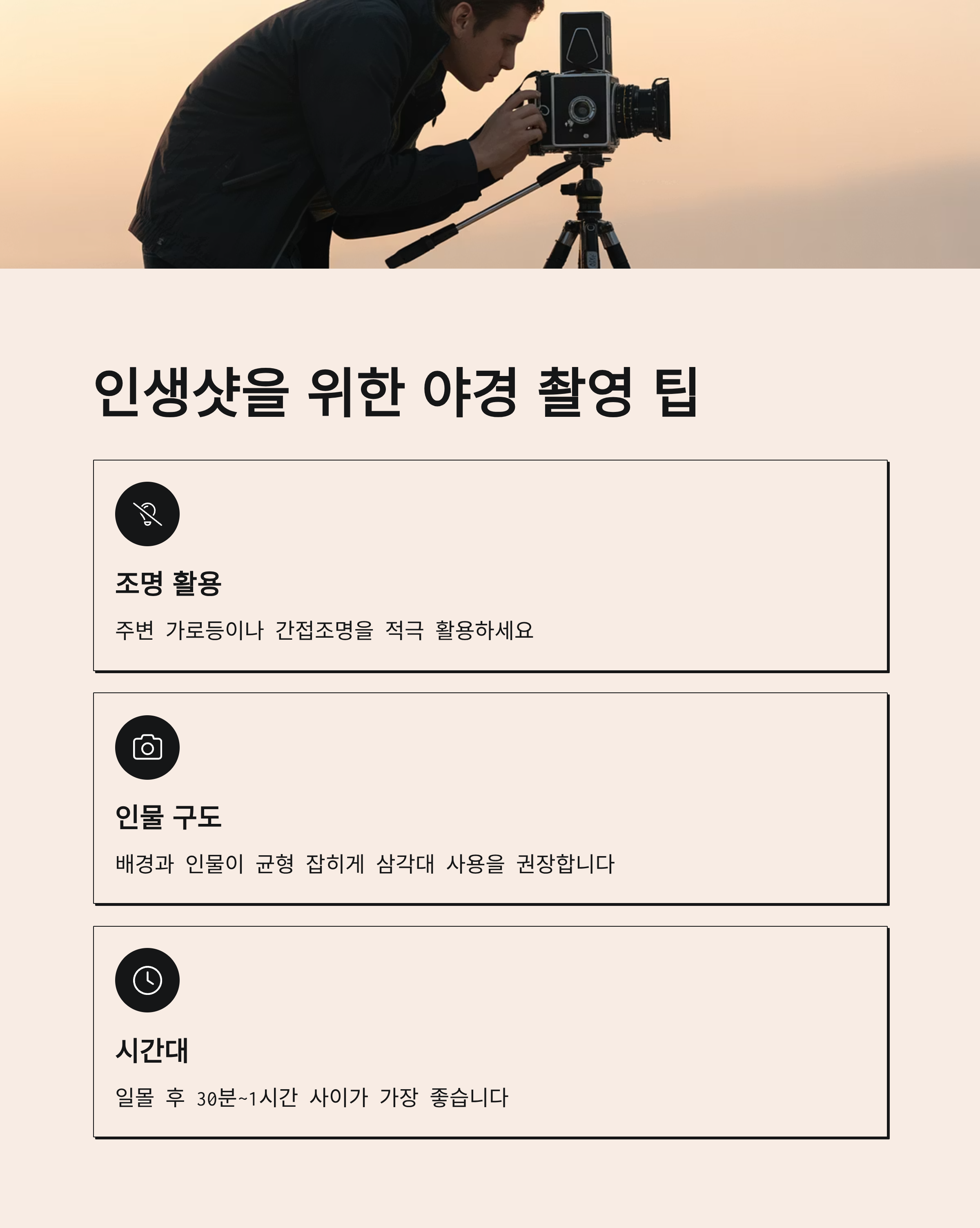 | 조명 활용 | 주변 가로등이나 간접조명을 적극 활용하세요 |
